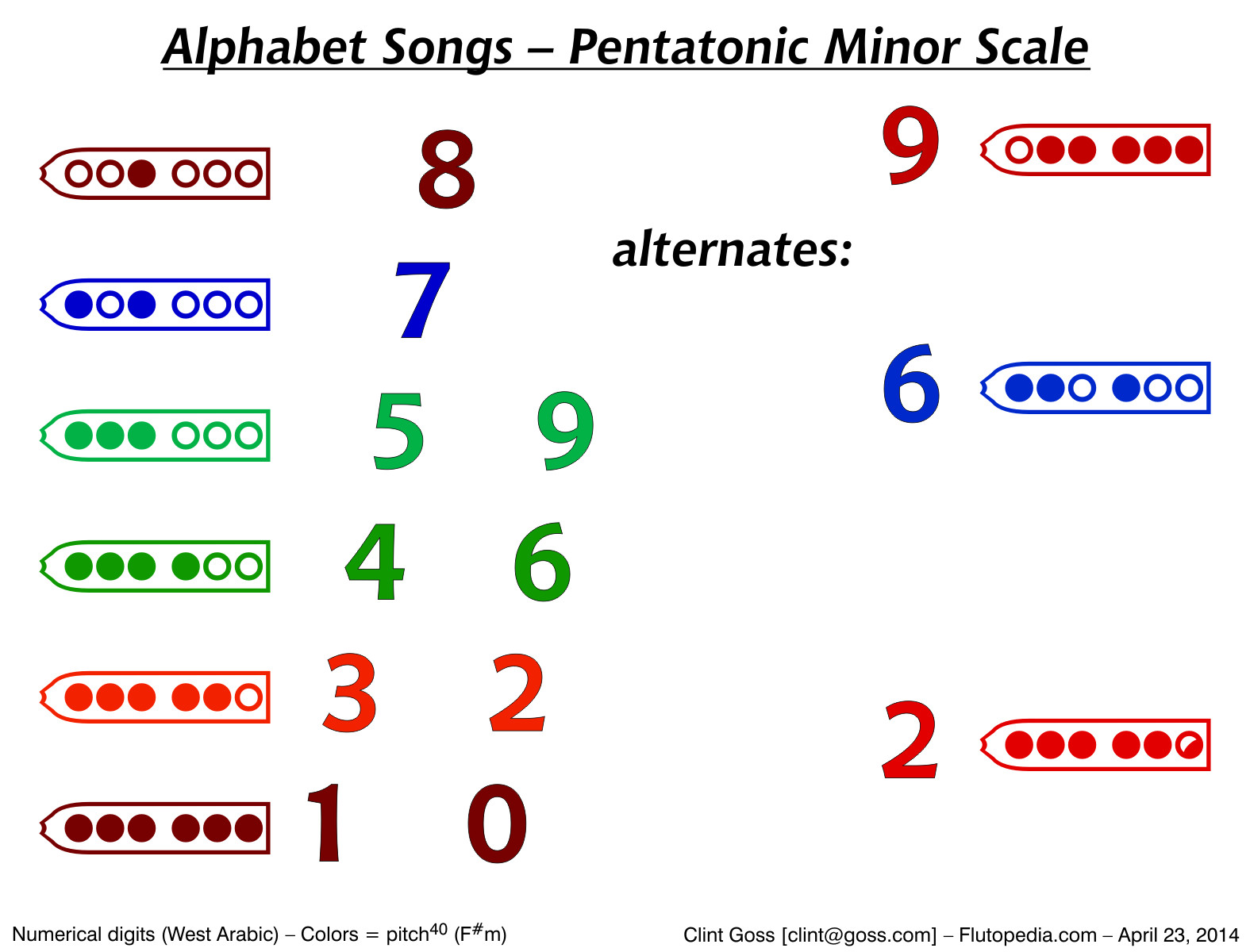 If we want an alphabet song chart that maps numeric characters onto the pentatonic minor scale, we have some choices. What I've done in my version is to use the degrees of the scale from music theory — a method that many people use to notate their music.