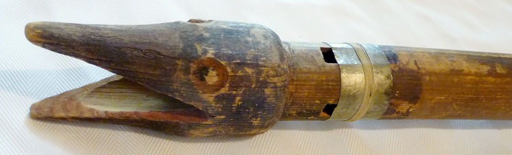 Condition: Between the blow pipe and fipple, there is a recessed, unfinished section in which something was either inlaid or wrapped. It currently has a loose wrapping of brass wire which seems not necessary or pertinent.2