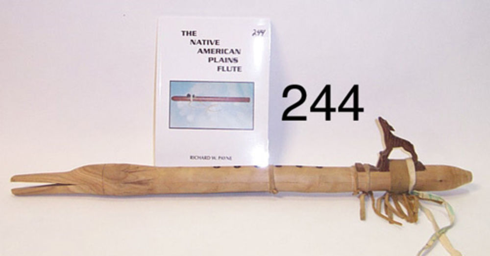 Remarks: Loon head flute made by Lester Goslin, carved wood coyote baffle block, 24” long.2