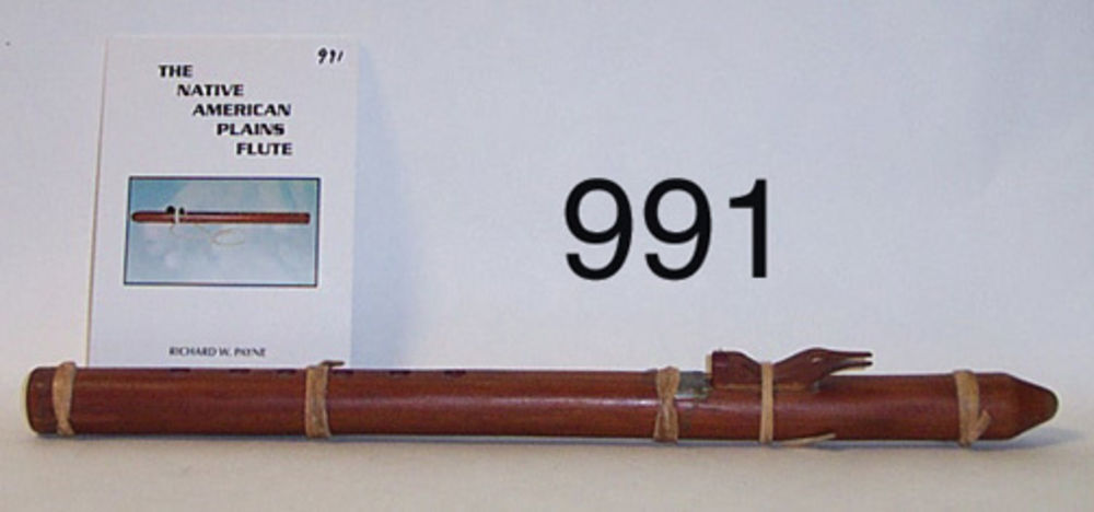 Remarks: Courting flute (Domba). Section of cedar painted red, split and hollowed, rejoined with pitch and tied with series of hide thongs. Roughly carved stop in shape of bird. 20.75" (53 cm). Records: The cracks are sealed with pine balsam. The six finger holes are burned through. Called a "love flute" and used for serenading. Illustrated in Ewers 1986: 165. (C, L). (from Merrill, William L. et al. 1997. A Guide to the Kiowa Collections at the Smithsonian Institution. Smithsonian Contributions to Anthropology, no. 40. Washington, D.C.: Smithsonian Institution Press.)1