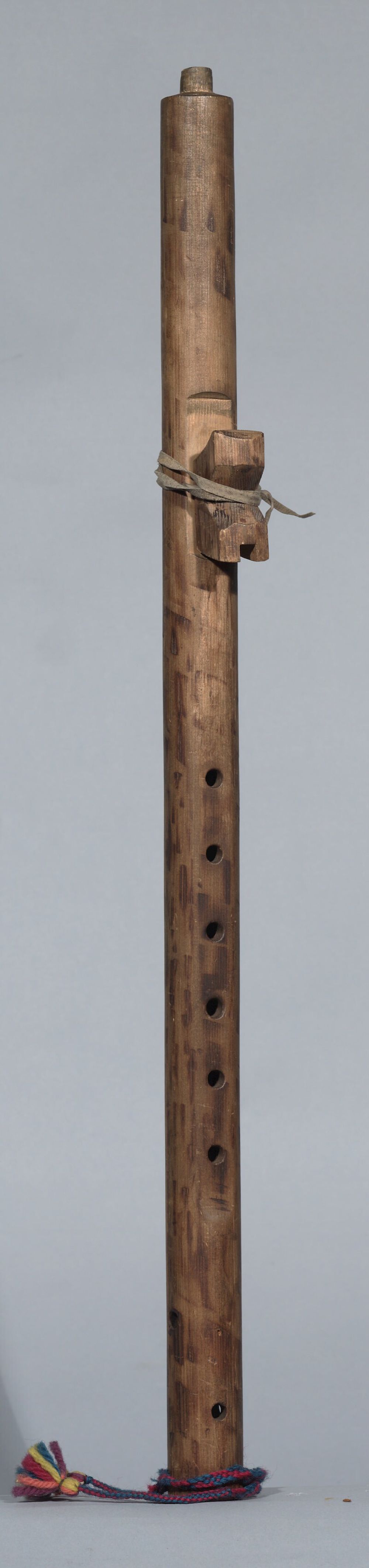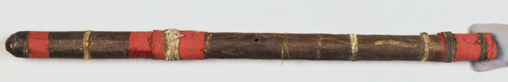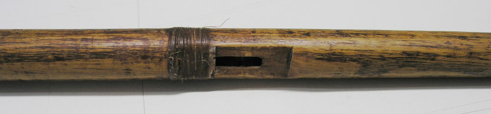 Remarks: Cylindrical body constructed of three sections of cane connected by crudely fitted socket-and-tenon joints. Proximal end of uppermost joint cut at steep angle. Bands of cotton (?) string wrapped in six places (missing or detached in four places). U-shaped window with widely chamfered lower edge. Duct block missing, but apparently held in place by pin (length 25 mm) carved from cane, protruding through wall of uppermost section about 15 mm from proximal end. Two fingerholes and one thumb hole, with chamfered edges, near distal end of lowest section.1
