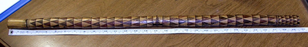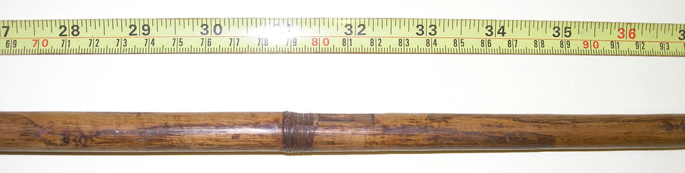 Remarks: Cylindrical body of cane with three nodes. Central node intact with rectangular window cut over top. Missing tied-on bandage to form duct. Three equally-spaced fingerholes in distal half.1