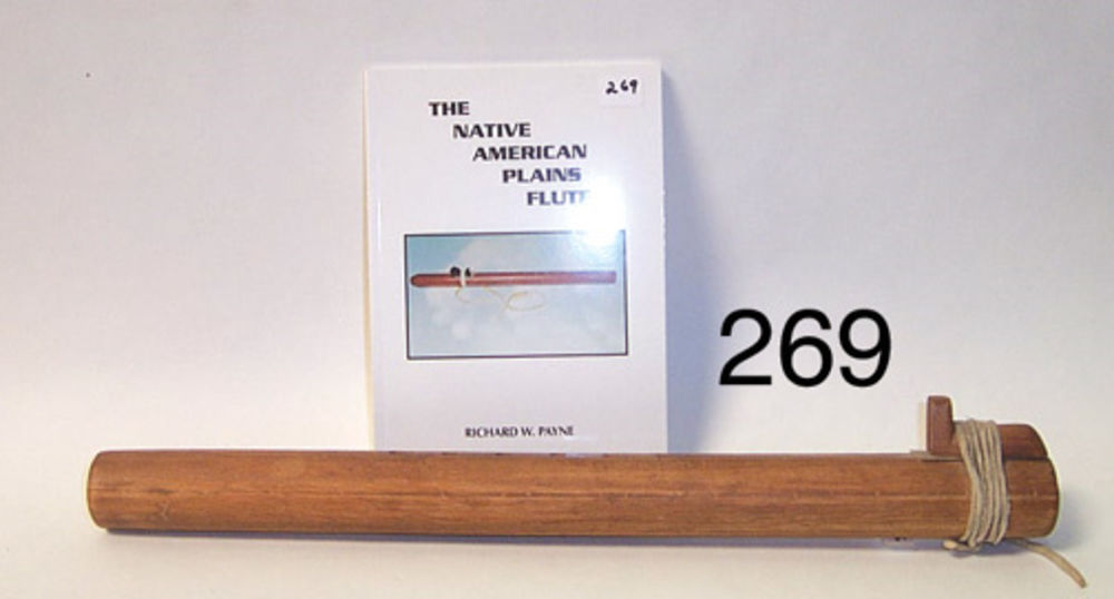 Remarks: The instrument is finely finished on the exterior, the upper half being stained a rich brown, and the lower half having three color schemes consisting of a blond middle section area, with the fingerhole flat stained brown as above, and the lower fourth of the instrument painted black and containing 5 ventholes, 3 round and 2 shaped like a 4-pointed star. The flue plate is lead and the wood flue cover is carved like a horse's head and neck. The mouthpipe is a bored-out sewing thimble over a wooden inner pipe. Rather than lashed with a leather thong, the flue cover is attached with a braided steel wire. The maker appears to have had access to a well-equipped shop, including a wood lathe. DCM ledger quotes letter from Thurlow Lieurance, who gave the flute to Miller: "This was made by Red Fox, a Qupaw Indian at Miami Oklahoma. I suppose this will be the last flute ever made by an Indian of this tribe. There are only about one hundred of them left. The old fellow tried to make an elaborate instrument. I have never seen an Indian flute just like this one."2