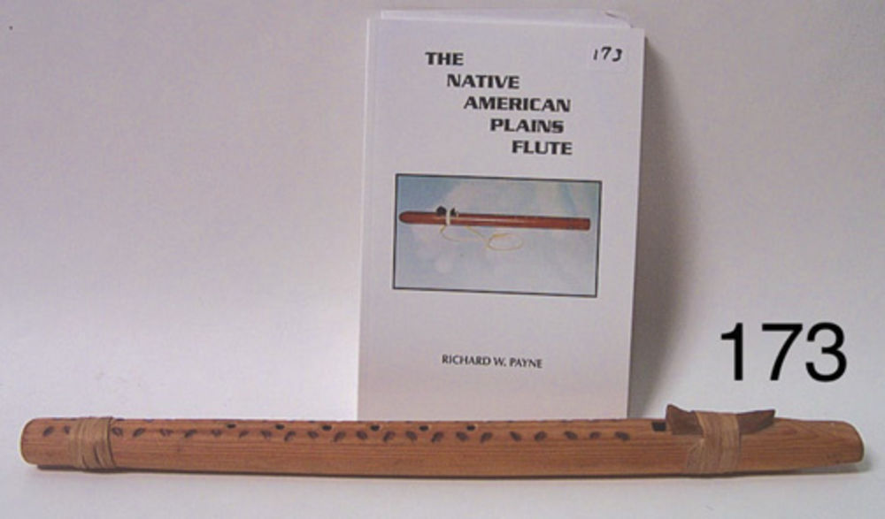 Remarks: Made under the direction of noted artist and teacher Dick West at Bacone College, is bored with a twist bit in two sections that are joined by a wooden collar. Probably the inspiration for the later made, auction item #812. Listed in flute book [page 31, figure 55]. The flute is approximately 23” long.2