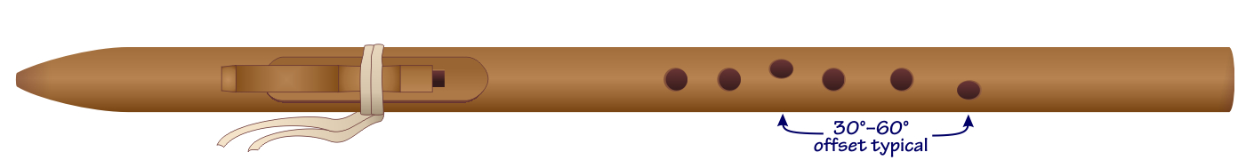 Also note that offsetting a finger hole by rotating it around to a different position on the bore does not affect the pitch produced. The pitch is primarily dependent on the station of the finger hole (location along the length of the sound chamber) as well as the size of the finger hole, thickness of the wall at the finger hole, and other factors.