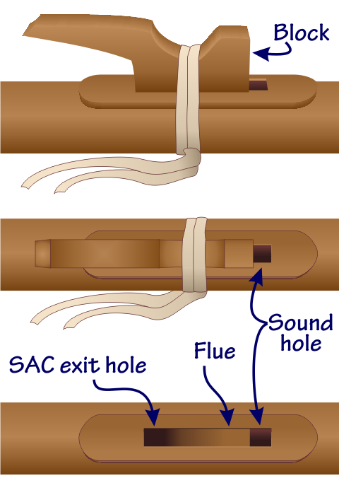 Cut-away image of a Native American flute, showing the breath hole, airflow, slow air chamber, plug, and resonating chamber